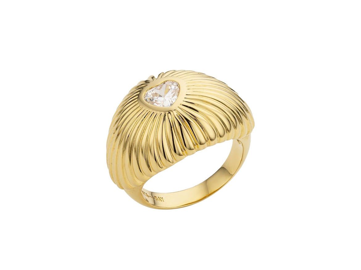 From Belgium: Made of 18k gold-plated brass, plated again with 24k gold, this domed ring features a rayed design with a center heart cubic zirconia. Available in sizes 6.5, 7, and 8.