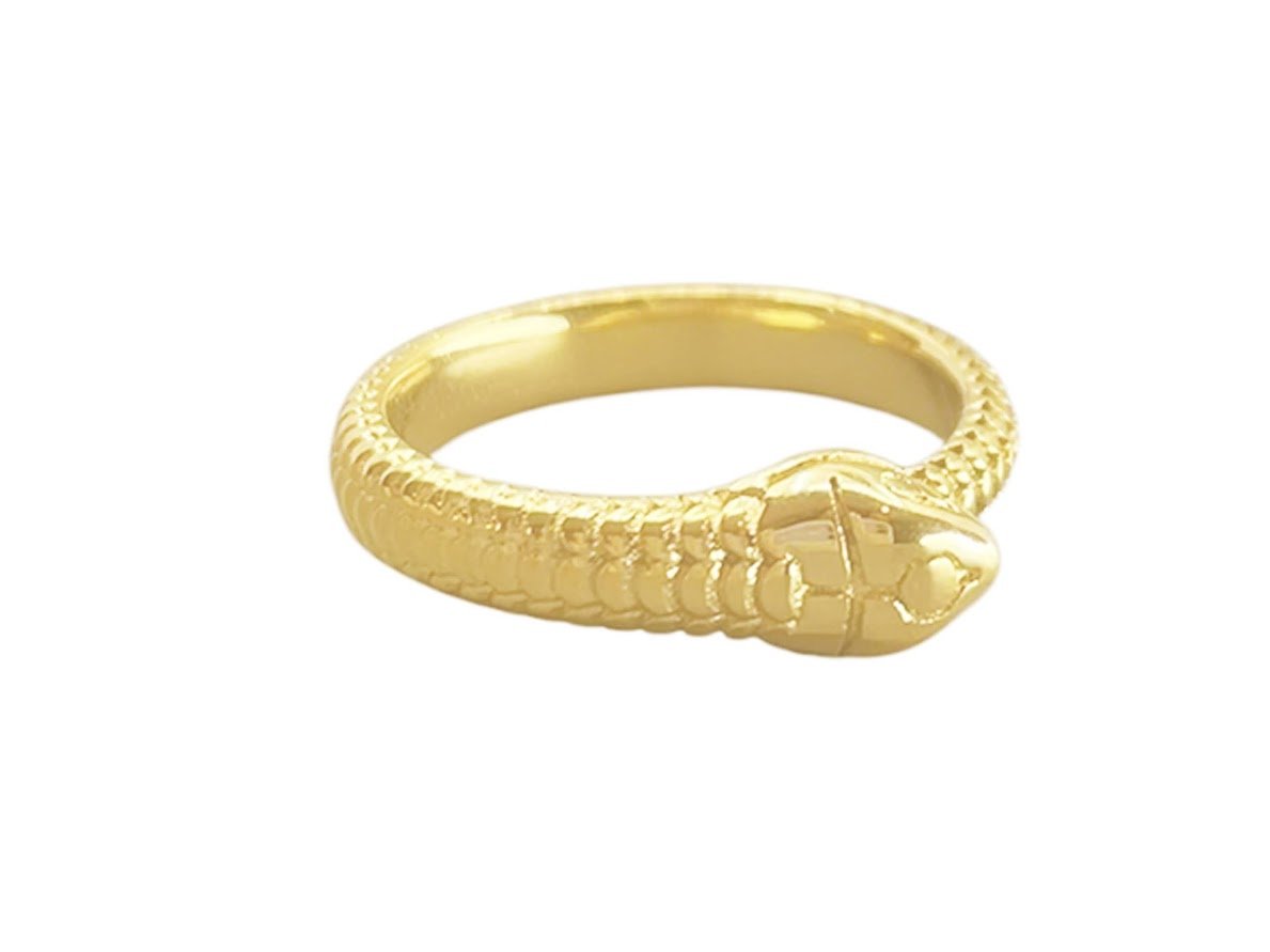 This 14k gold-plated snake ring features a PVD waterproof coating and is available in sizes 6, 7, and 8.