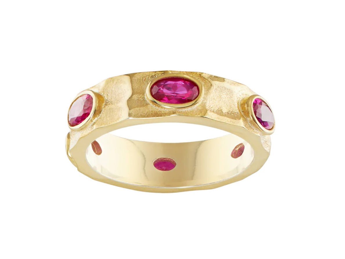 A gold vermeil stackable band with red and clear oval cubic zirconia. Size 7.