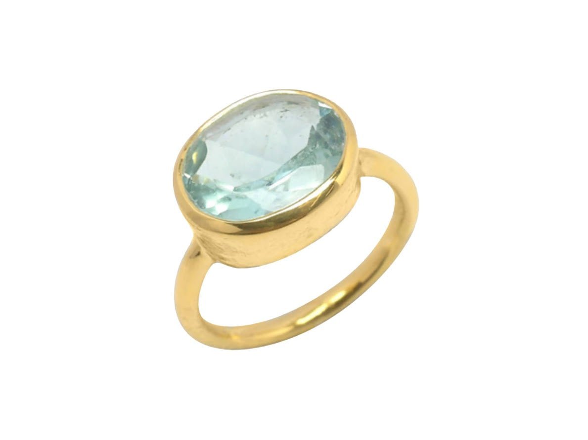 A 22k gold vermeil band features a chunky oval light blue bezel-set glass stone. Available in sizes 6, 7.5, and 9.