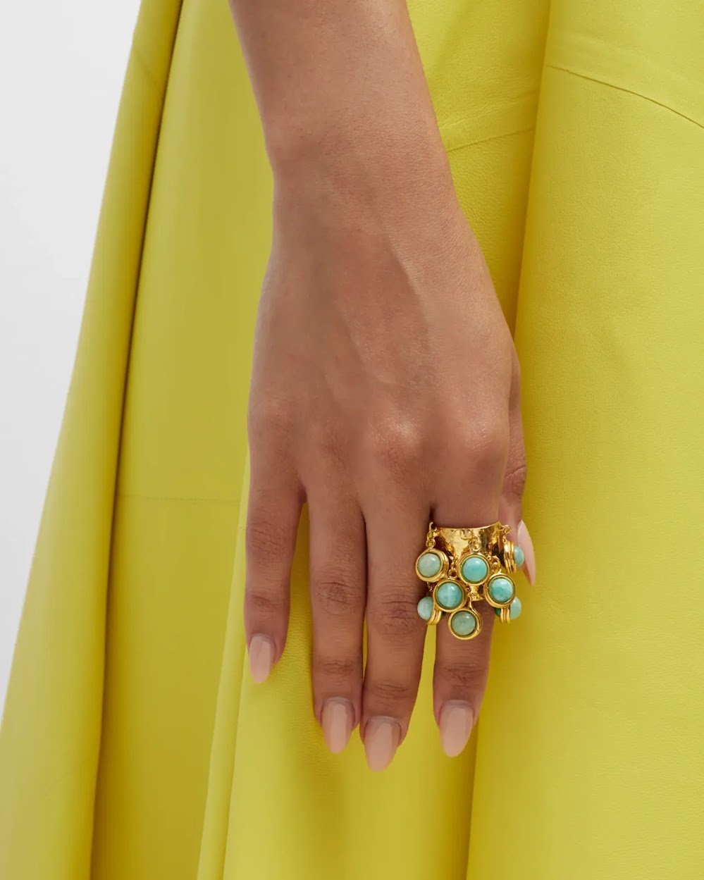 From Sylvia Toledano and made in France: Made of 22k gold over brass, this dazzling ring features malachite and amazonite stones, all set on tiny chains for movement and delight. Nickel free and adjustable.