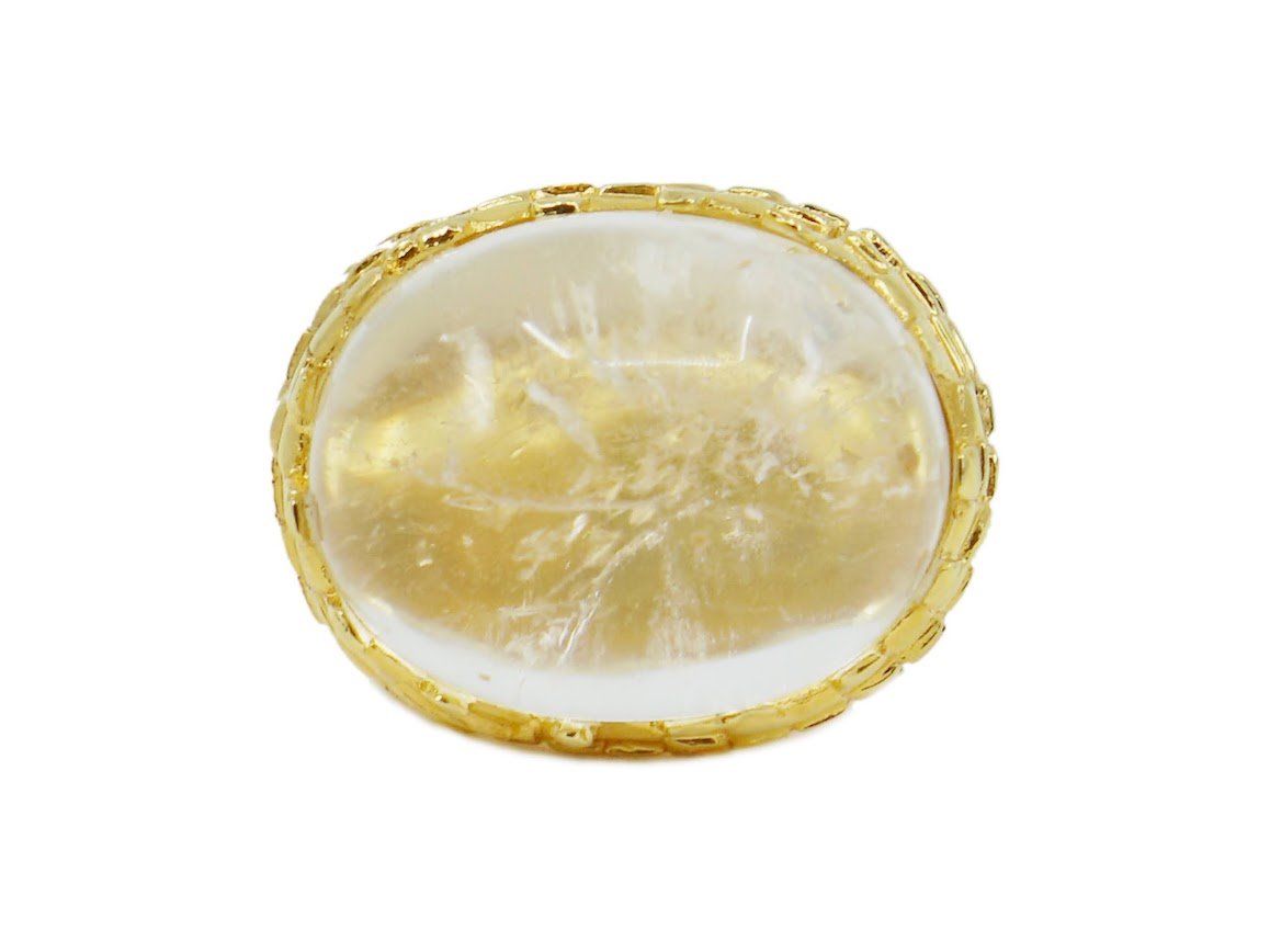 From Tay of London: A large oval rock crystal cabochon stone is set within a tile-textured mount made of 18k gold plated over polished brass. The stone measures 22mm by 19mm. Size 7. Nickel free.