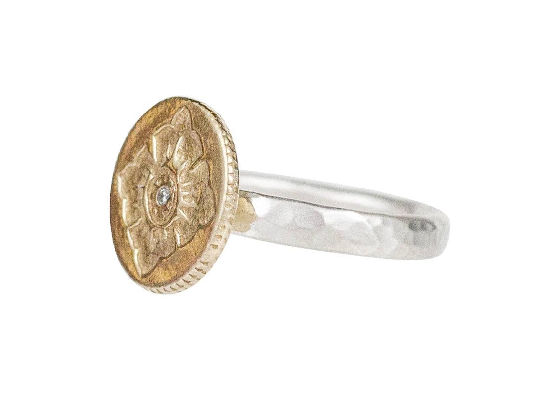 A sterling silver hammered shank that's 3mm wide features a flower disc with a diamond at the center. Flower disc measures 14mm in diameter. Size 7 available. Can also be ordered in sizes 6 and 8.