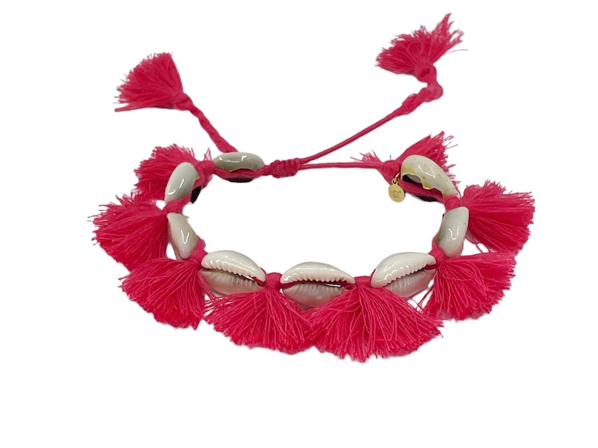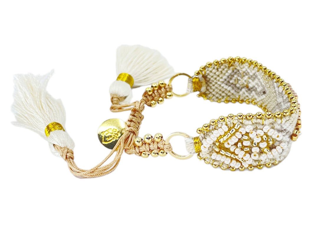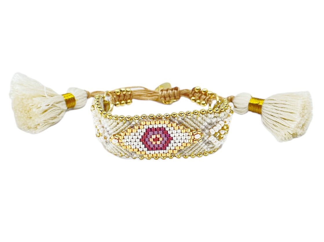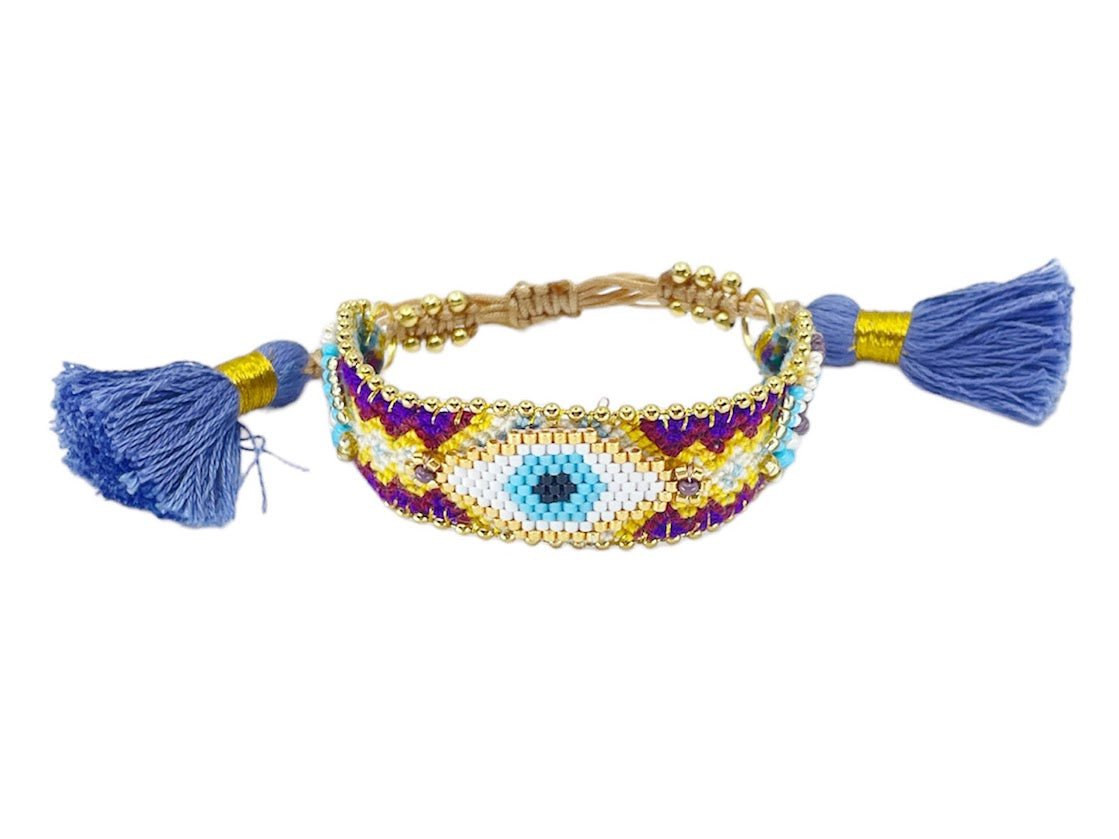 Beige Woven Bracelet with Purple Beaded Evil Eye and Tassels.