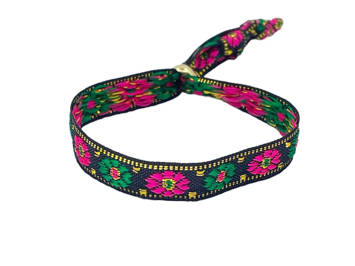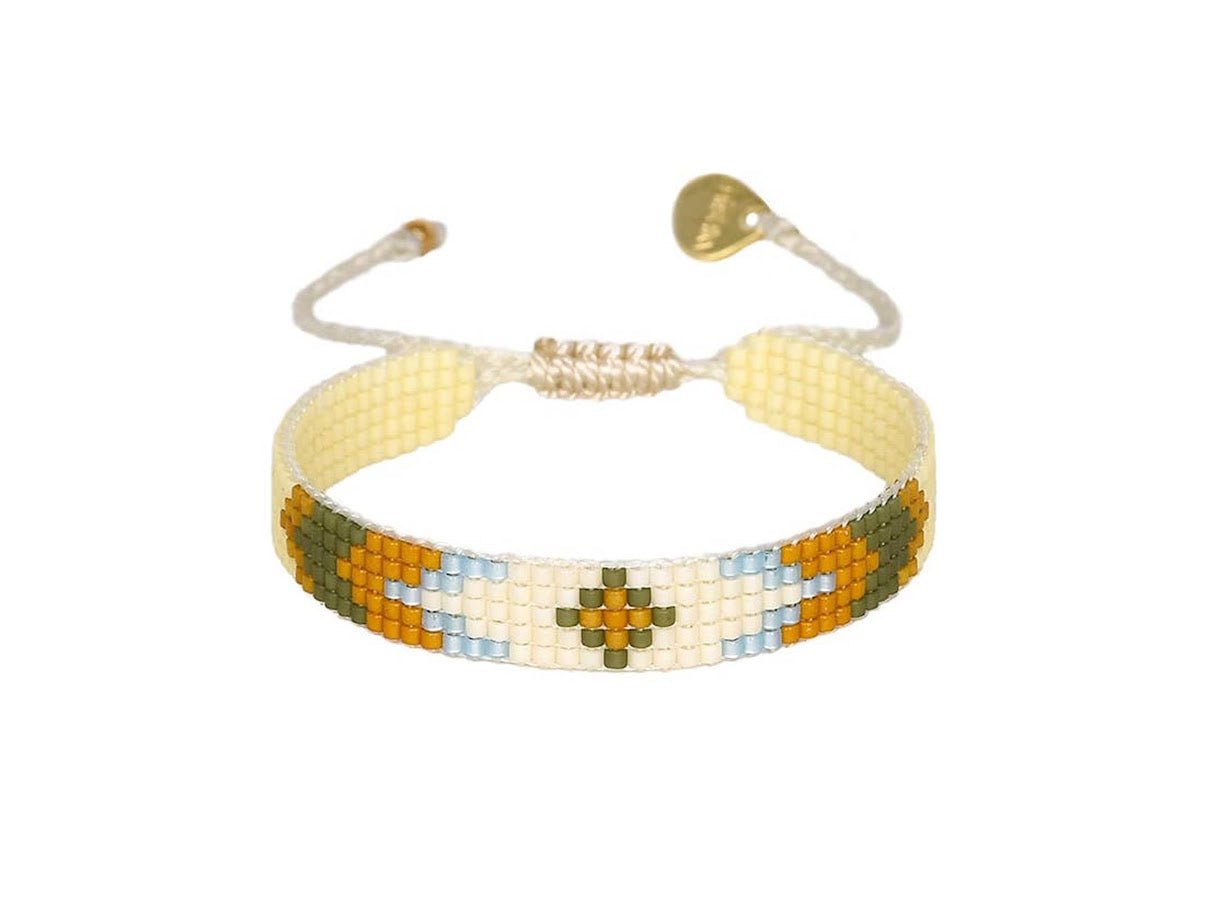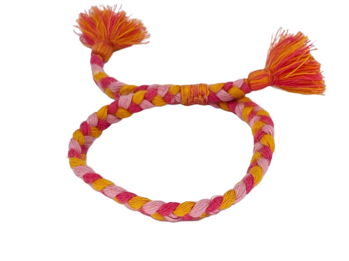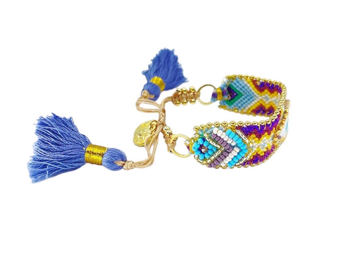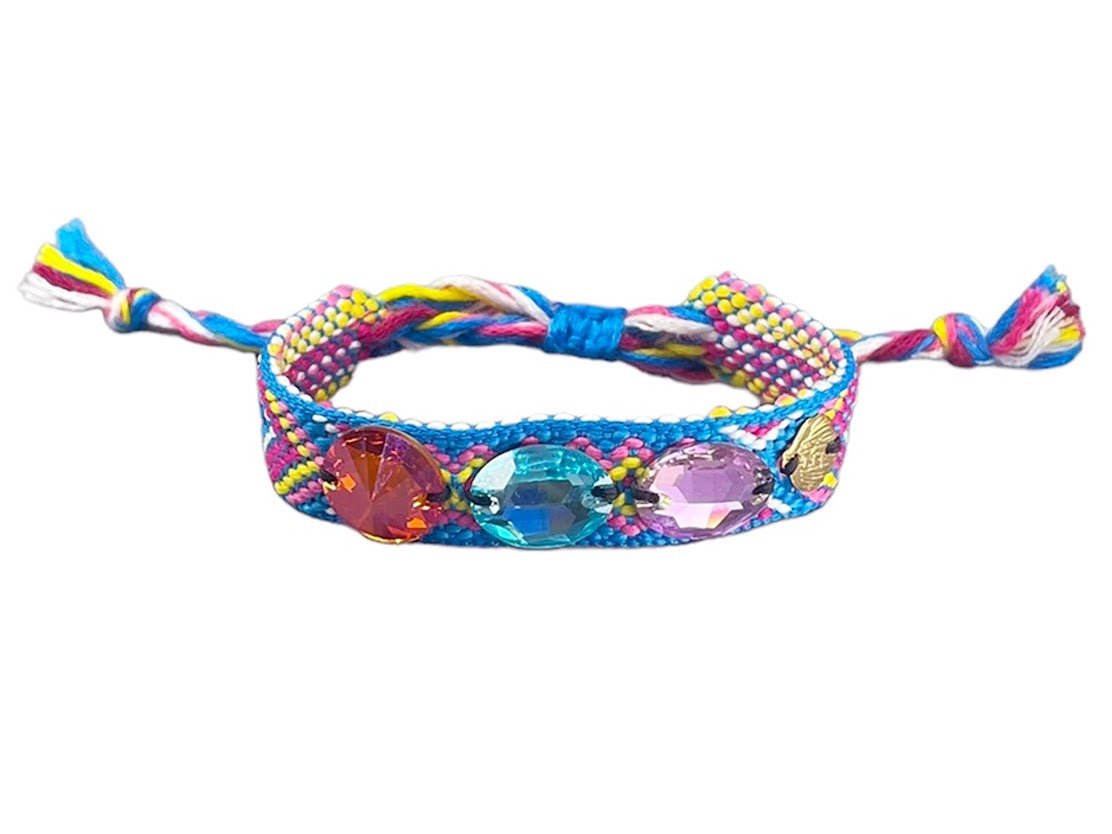 Handwoven Bracelet with Yellow, Pink, Blue, and White Crystals.
