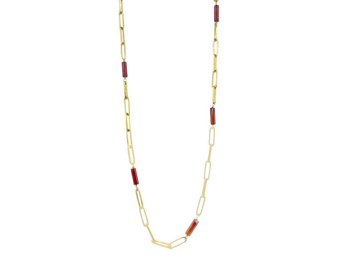 From Tay of London: Barrel-shaped carnelian stones highlight this rectangular link chain of 24k gold plate. Can be special ordered with other stones. 42 inches long. Nickel free.