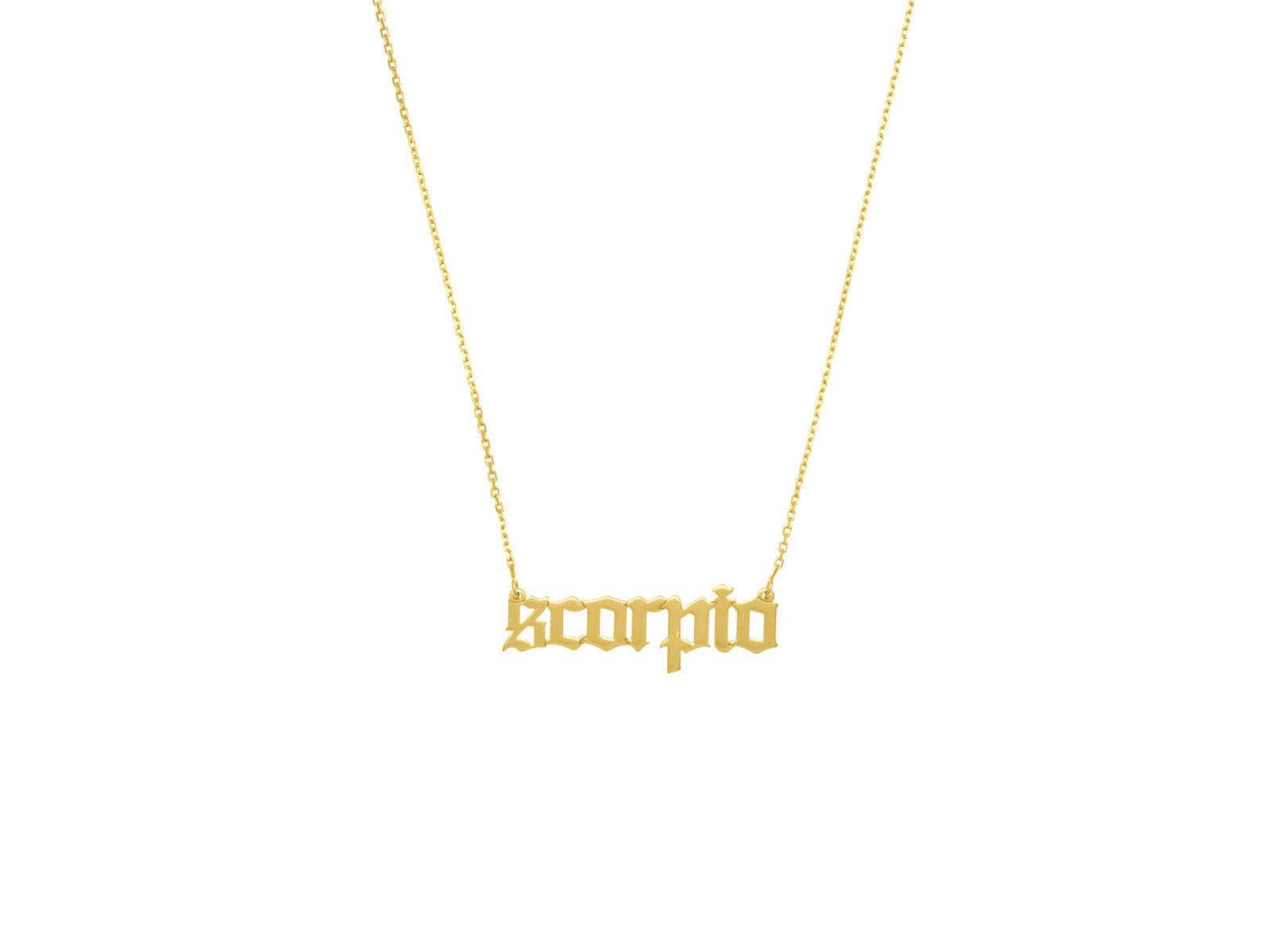 Made of 14k yellow gold, this necklace features the zodiac name "scorpio" spelled out in a gothic font. 18 inch chain with a lobster clasp.