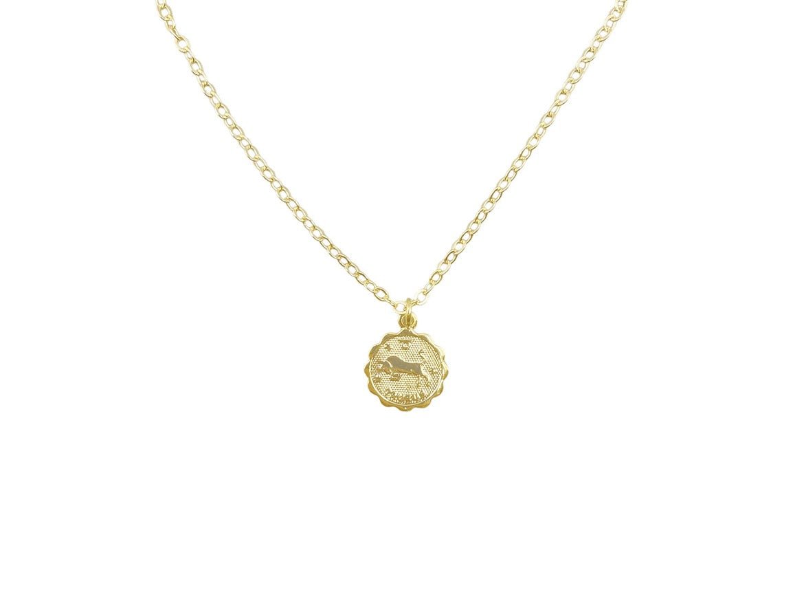A 14k gold-filled chain that's 16.5 inches long features a 14k gold-plated pendant that measures 12mm in diameter.