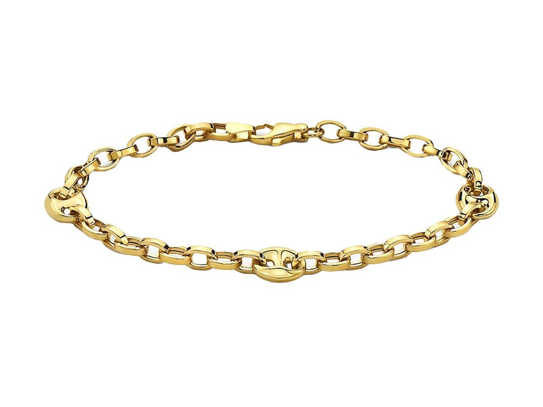 Made of 10k yellow gold, this versatile bracelet features puff mariner links interspersed in an anchor chain. 8.5mm thick. 8 inches long. Lead and nickel free. Can be shortened.
