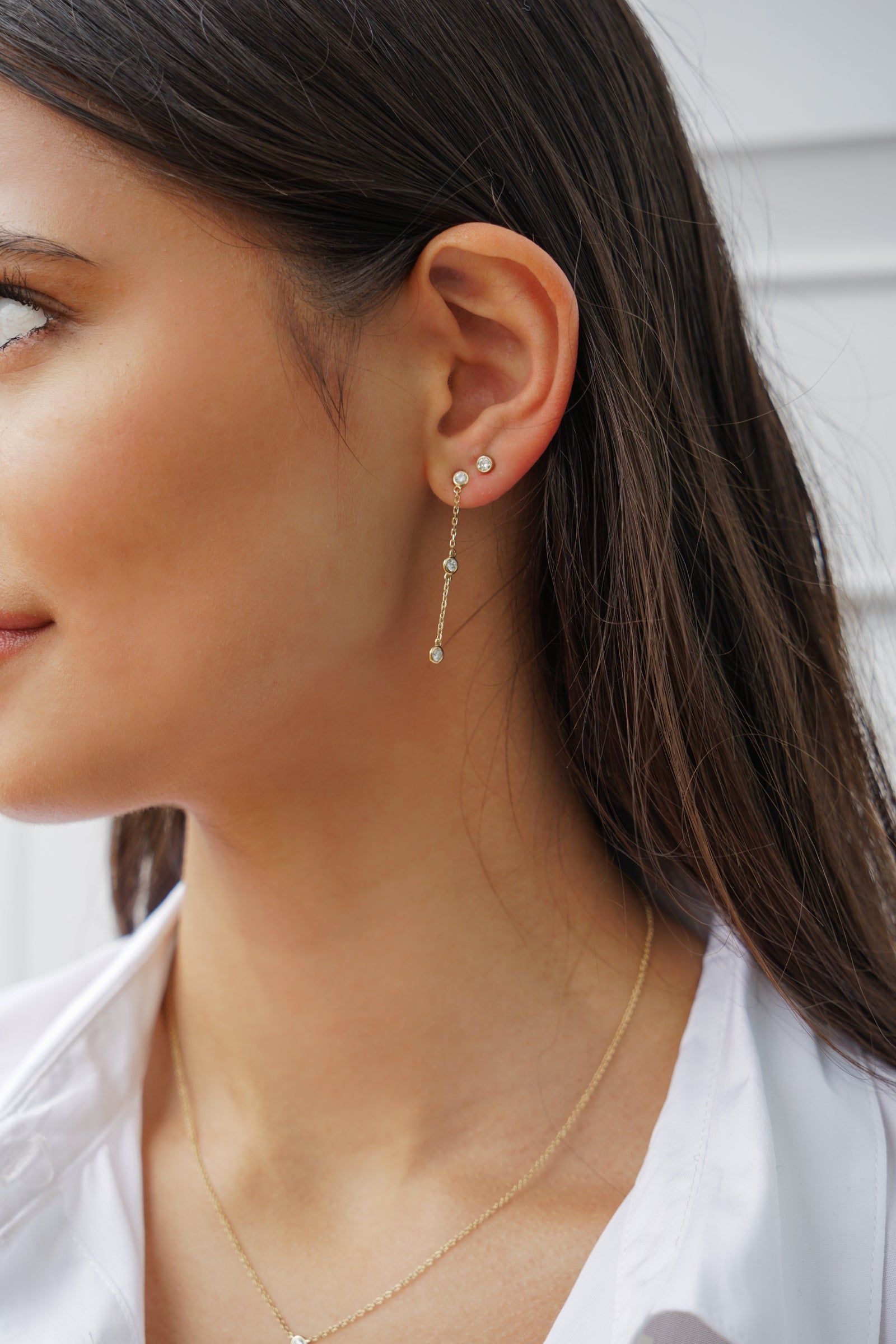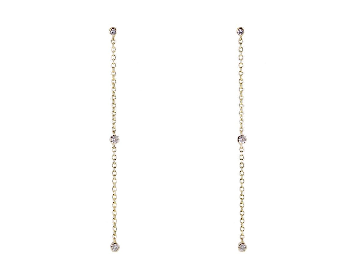 A pair of 14k yellow bold chain drop earrings with three bezel set diamonds.