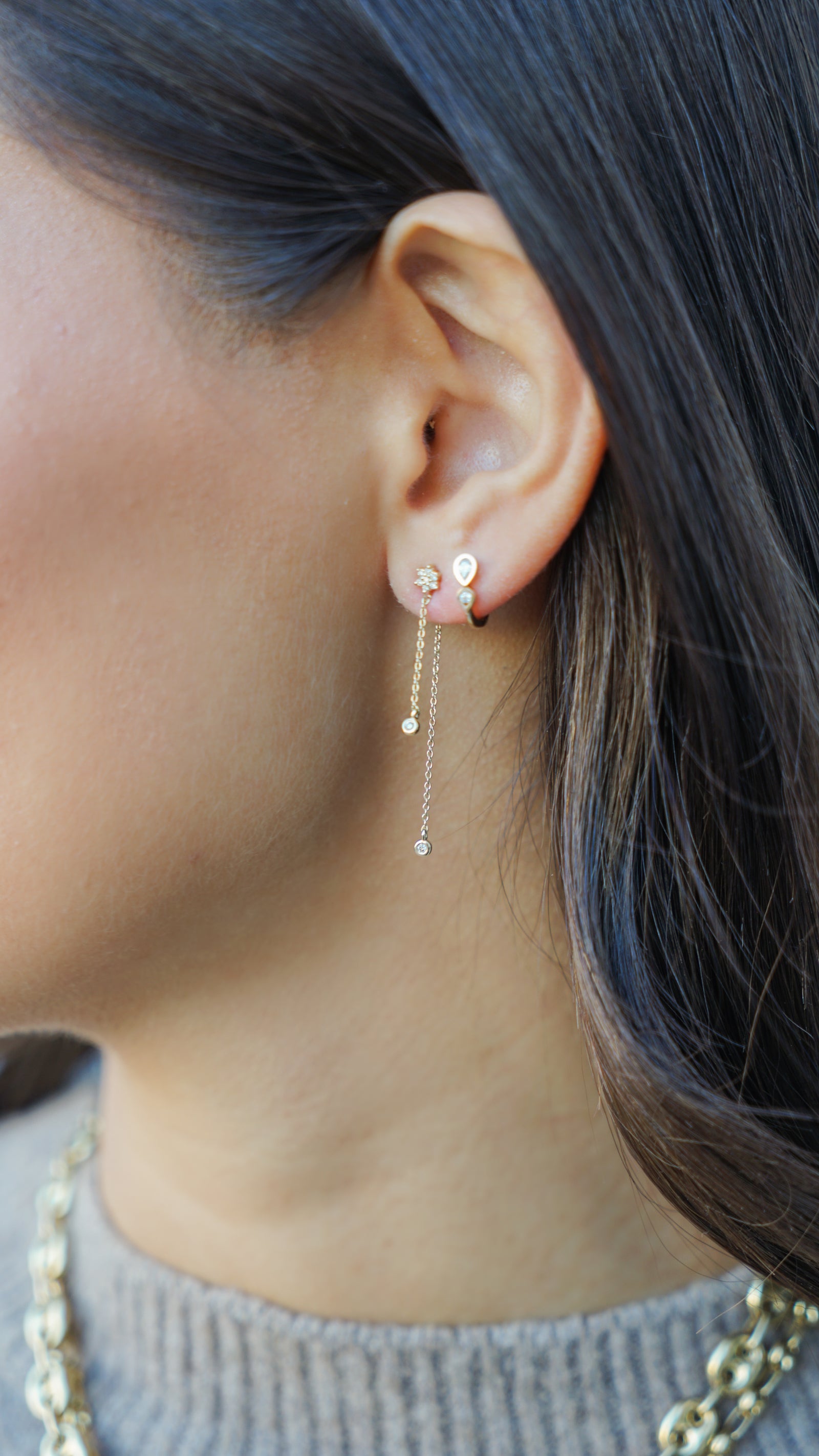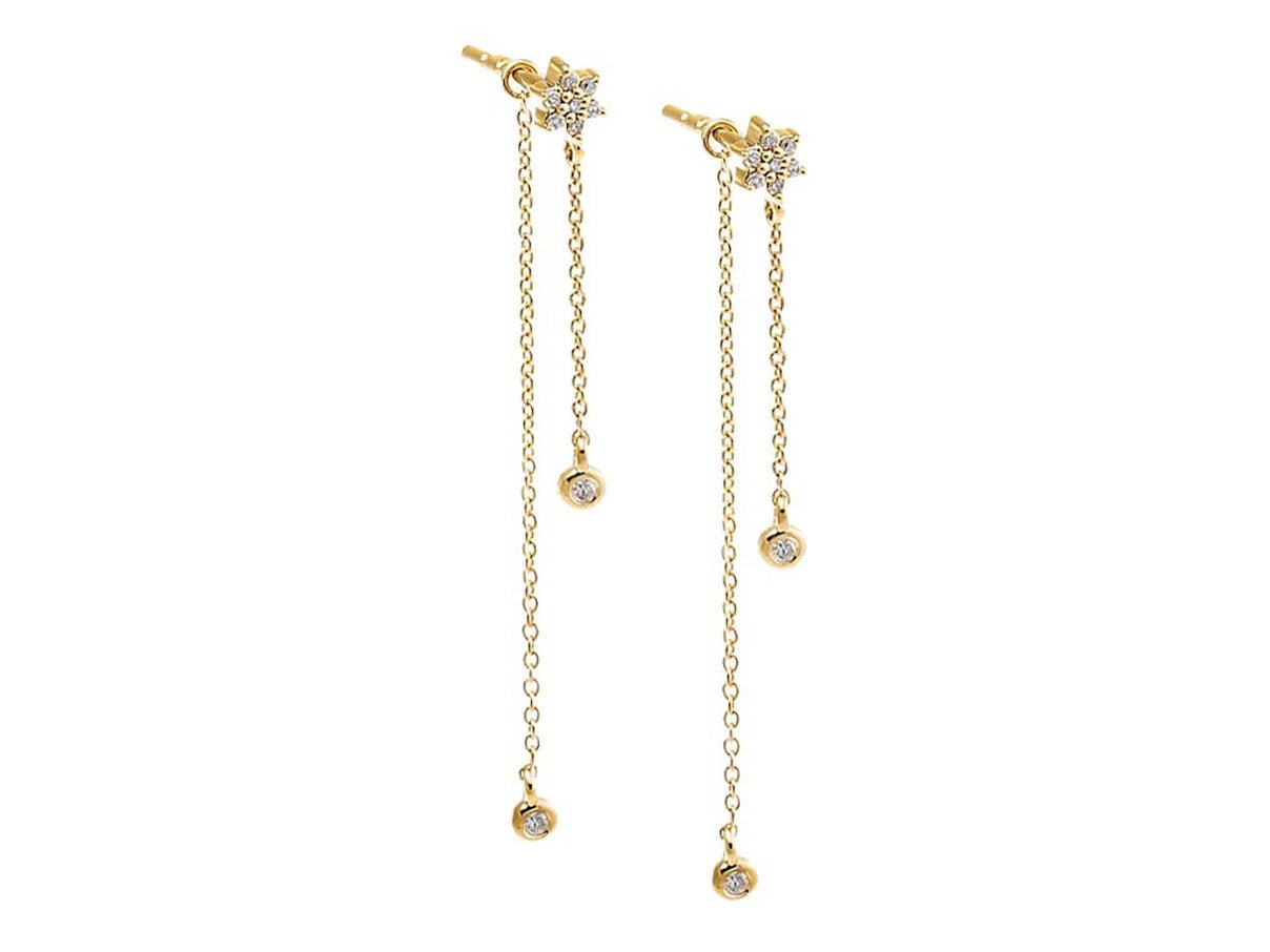 Crafted in 14k gold, these earrings feature a dainty 4mm diamond flower paired with 1.5mm bezel-set diamonds on chains, for a total of .12ct of brilliant round-cut natural diamonds graded I-J in color and S12 in clarity. Chains measure .5 inch and 1.5 inches for a graceful, cascading effect. Post-back closures. Longer chains are removable.