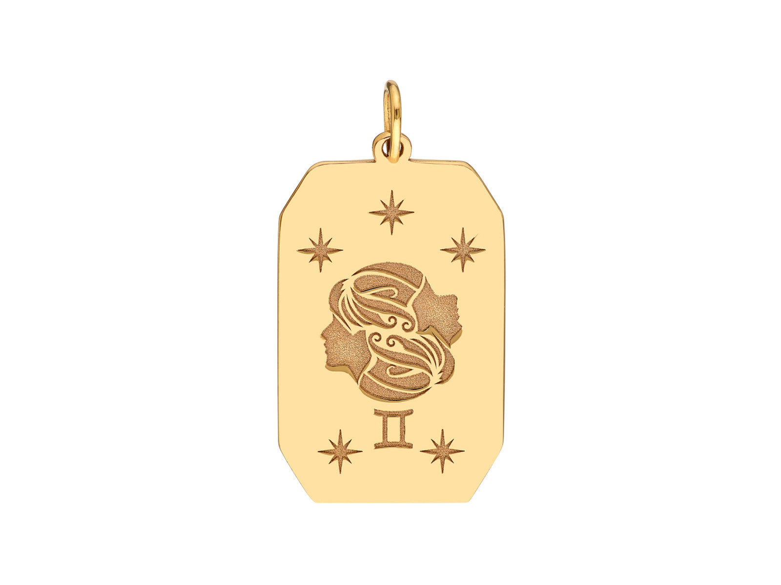 Made of 14k yellow gold, this 13mm by 20mm pendant is engraved with the zodiac sign for Gemini. Pair it with your chain of choice.