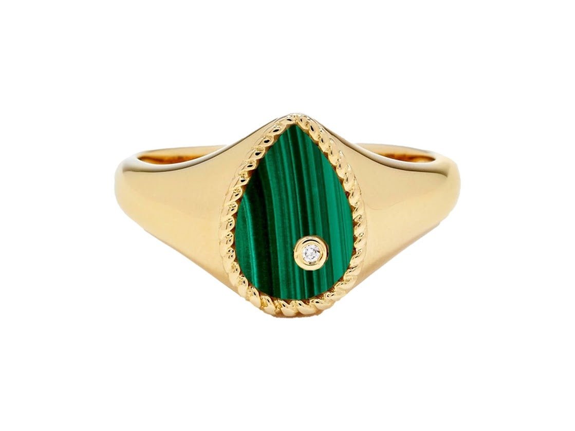 Made of 9k yellow gold, this signet ring features .36ct of malachite and a .003ct diamond. Sizes 2.25 to 8.25 are available.