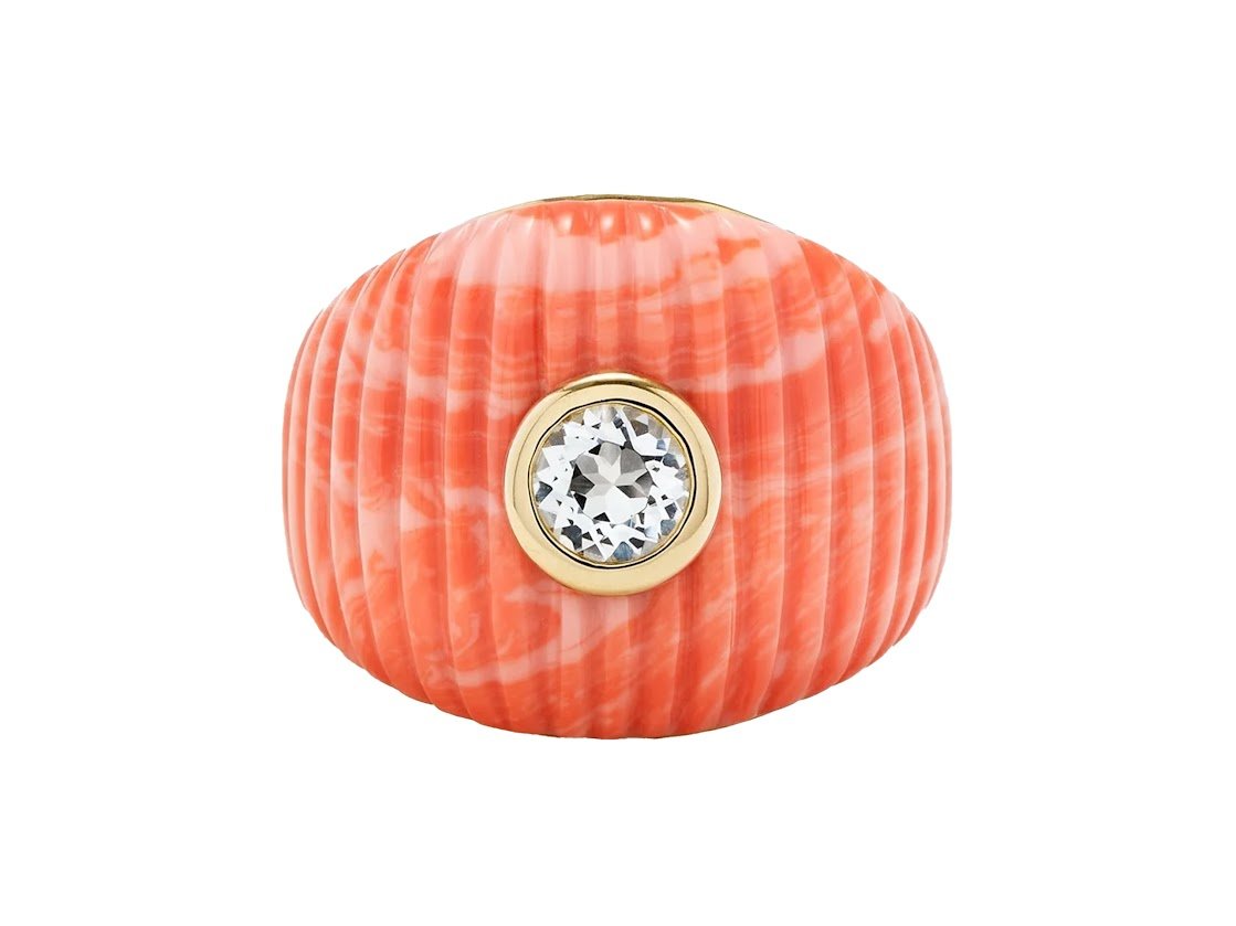 A 9k yellow gold dome ring with 19k of ridged coral and a .52ct bezel-set white topaz stone at the center.
