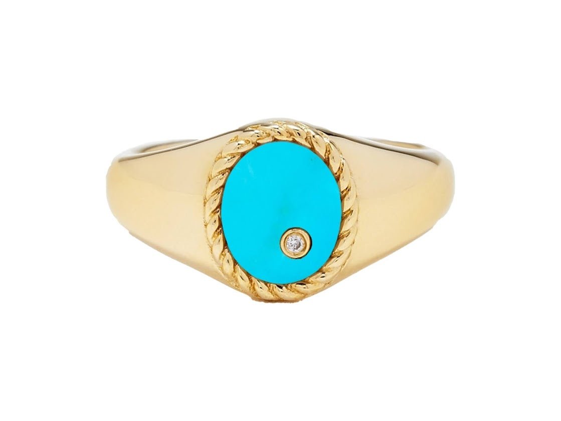 Made of 9k yellow gold, this signet ring features .2ct of turquoise and a .003ct diamond. Sizes available are from 2.25 to 8.25.