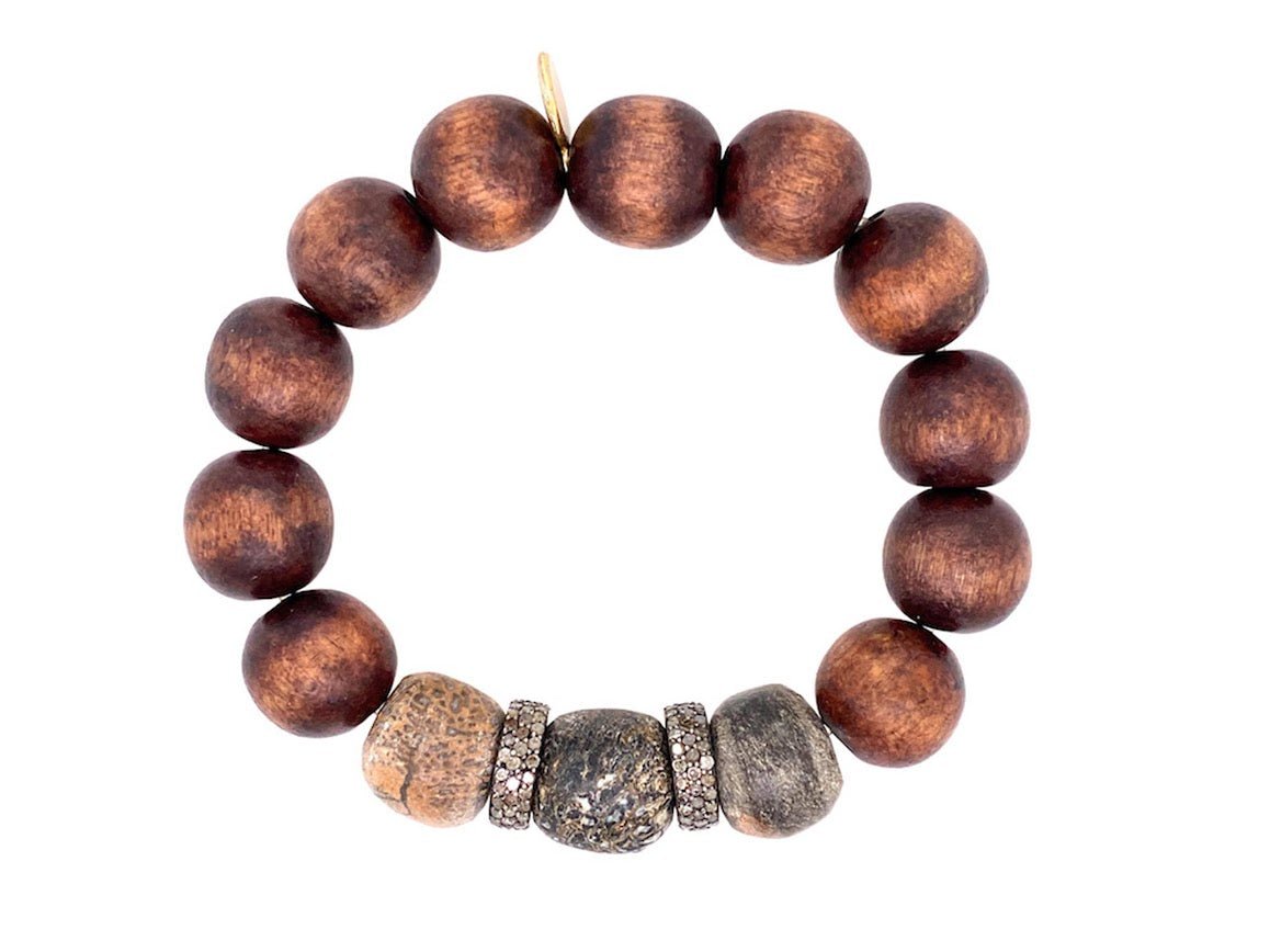 A mix of high, low, and history, this bracelet offers brown wood beads, plus three stegadon fossil beads and two rhodium roundels that are covered with pave diamonds. Lifetime restringing. Can be custom sized at no additional charge.