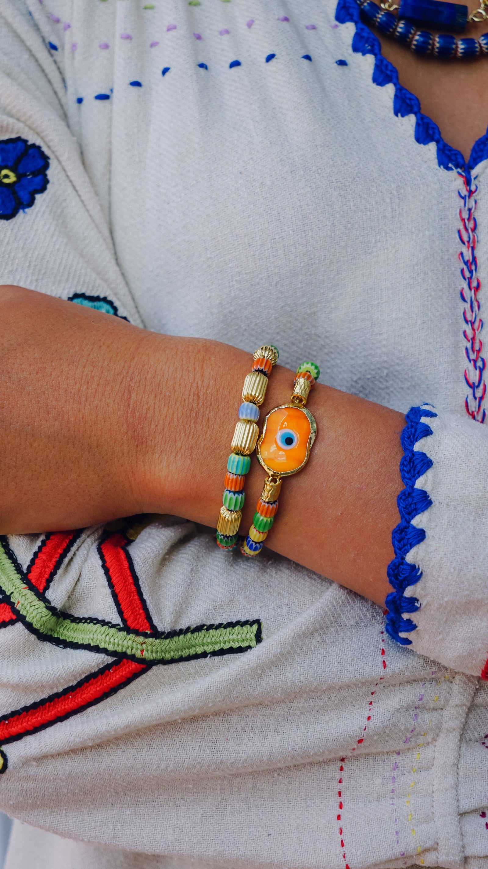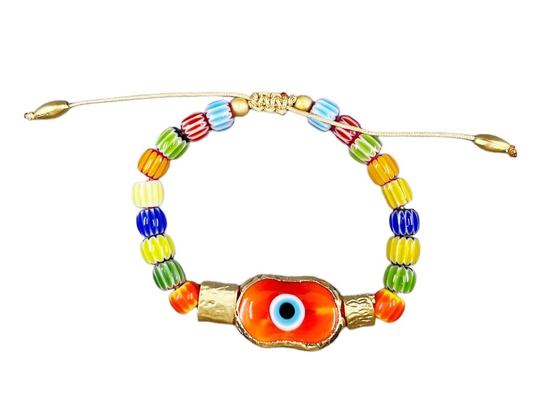 An orange Murano glass evil eye bead highlights an adjustable bracelet of Venetian ceramic ridge beads and gold-plated beads.