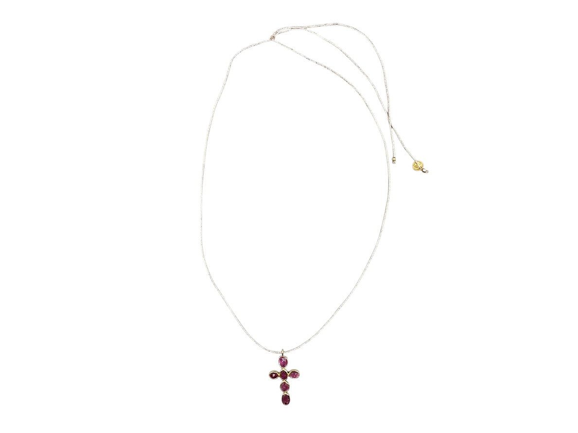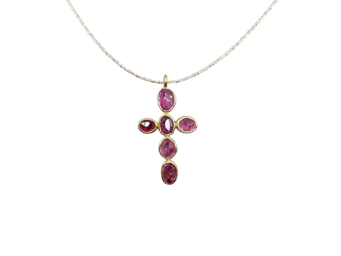 A 27mm gold-plated cross with pink tourmaline stones hangs from a lurex thread.