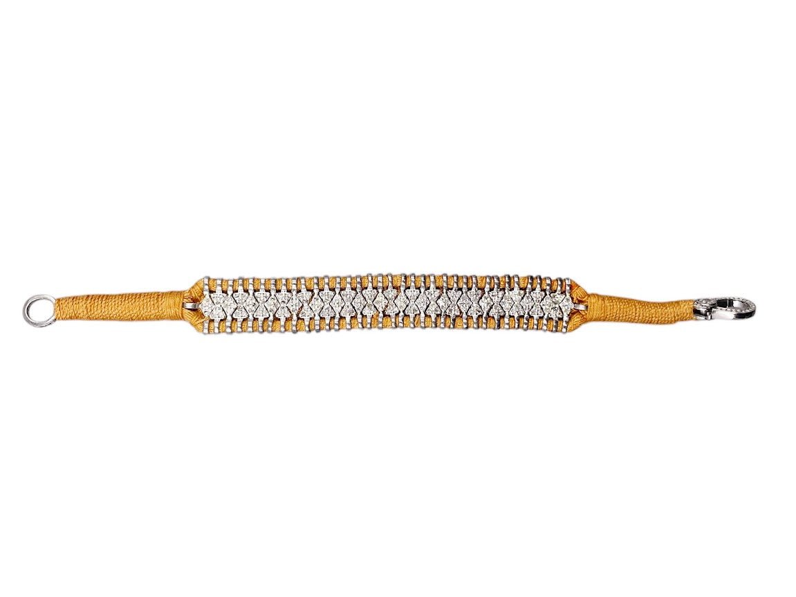 A sterling silver structure, woven with walnut cotton and diamonds, measures 7 inches long with a sterling silver and diamond lobster clasp. A Middlemarch exclusive, this bracelet can be ordered in custom lengths and colors. Please contact the store for details.